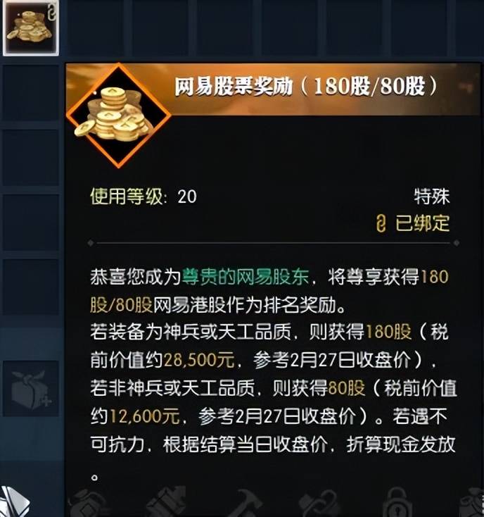 折合成人民币约有12600之多!特别是武器、护腕、腰带、鞋子、戒指、项链六大榜单登顶的玩家,更有机会拿到非绑神兵碎片、180股网易港股(价值约28500元)!好家伙,这真是人在家中玩游戏,莫名其妙就成“网易股东”了!