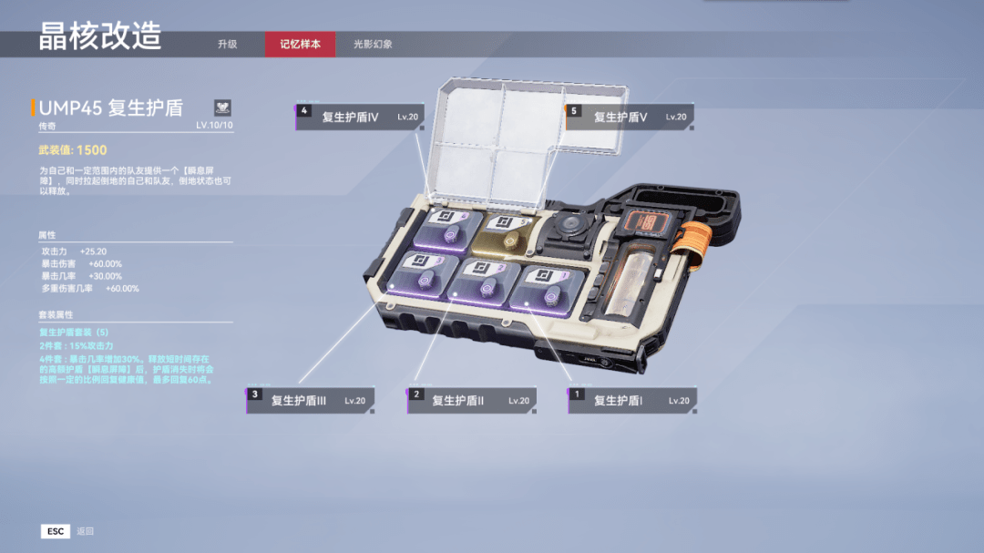 搭配「复生护盾」记忆样本四件套可在发动护盾的基础上额外获得一定的血量回复能力,当战局内血量告急而又无暇使用回复包时,可利用此技能回血。