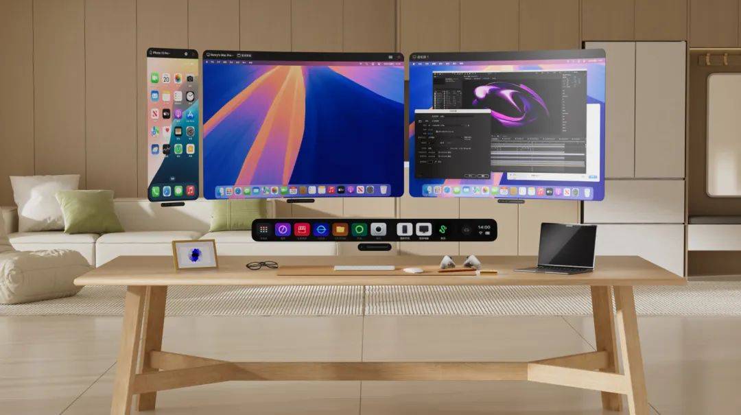 比如用户就能把屏幕放在正面、背后,甚至是头顶,而「全景工作台」最多可以兼容 20 款应用窗口,并支持窗口拉大缩小。