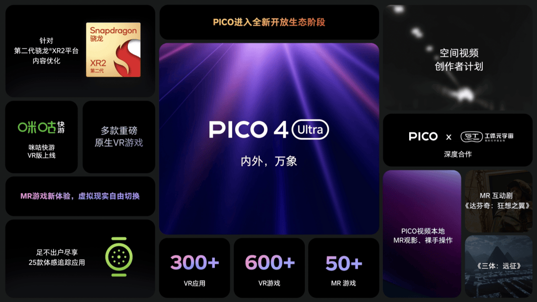 与《三体》、工体元宇宙等伙伴合作的视频内容,也将进一步扩充 PICO 4 Ultra 的观影体验。