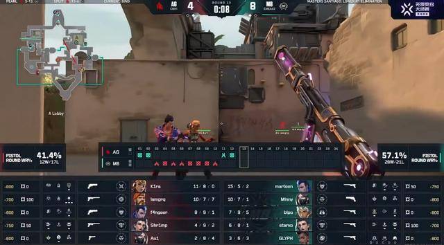 第12回合AG在A前点位顶住M8的前压,利用人数优势多条枪线打掉M8。上半场AG 4-8 M8。
