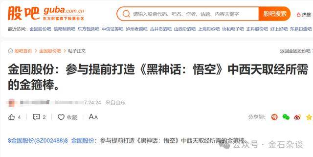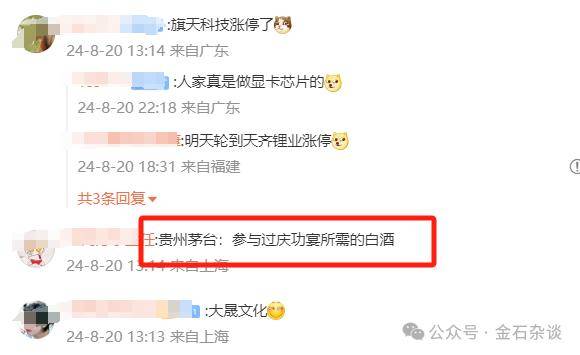 对于金固股份此番言语,网友们脑洞大开。金石综合网友消息:听说,明天等着涨停的是大晟文化、大胜达、旗天科技、天齐锂业,笑死了,毕竟今日云里物里30cm涨停,A股的尽头是玄学...甚至连茅台也加入了《悟空》概念,因为参与过庆功宴所需的酒。