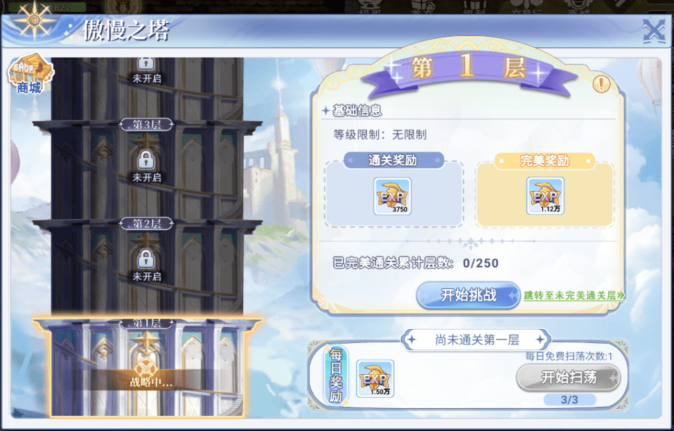 角色达到33级时开启「傲慢之塔」副本,在这里我们需要努力突破难关以前往更高层,在过程中获得成长(大量的经验奖励)。