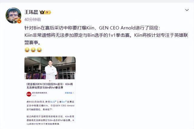 Kiin非常遗憾将无法参加原定和Bin选手的1V1拳击赛,Kiin将按计划专注于英雄联盟赛事。