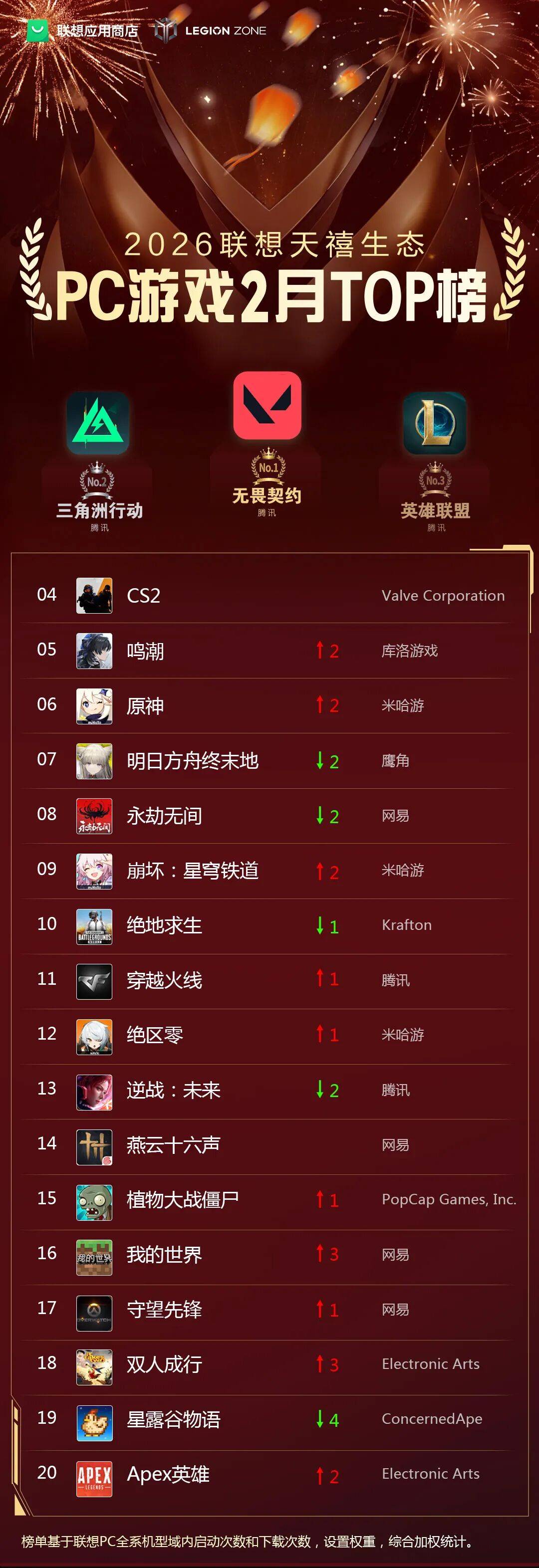 榜单头部,腾讯的《》《》《》连续霸占TOP 3。其中《无畏契约》开启了新春限时狂欢和高校瓦友社活动;《三角洲行动》步入新赛季,联动刘涛、海底捞;《英雄联盟》推出端手游联动新春会、跨界联动淘宝闪购,并持续加码大乱斗模式。