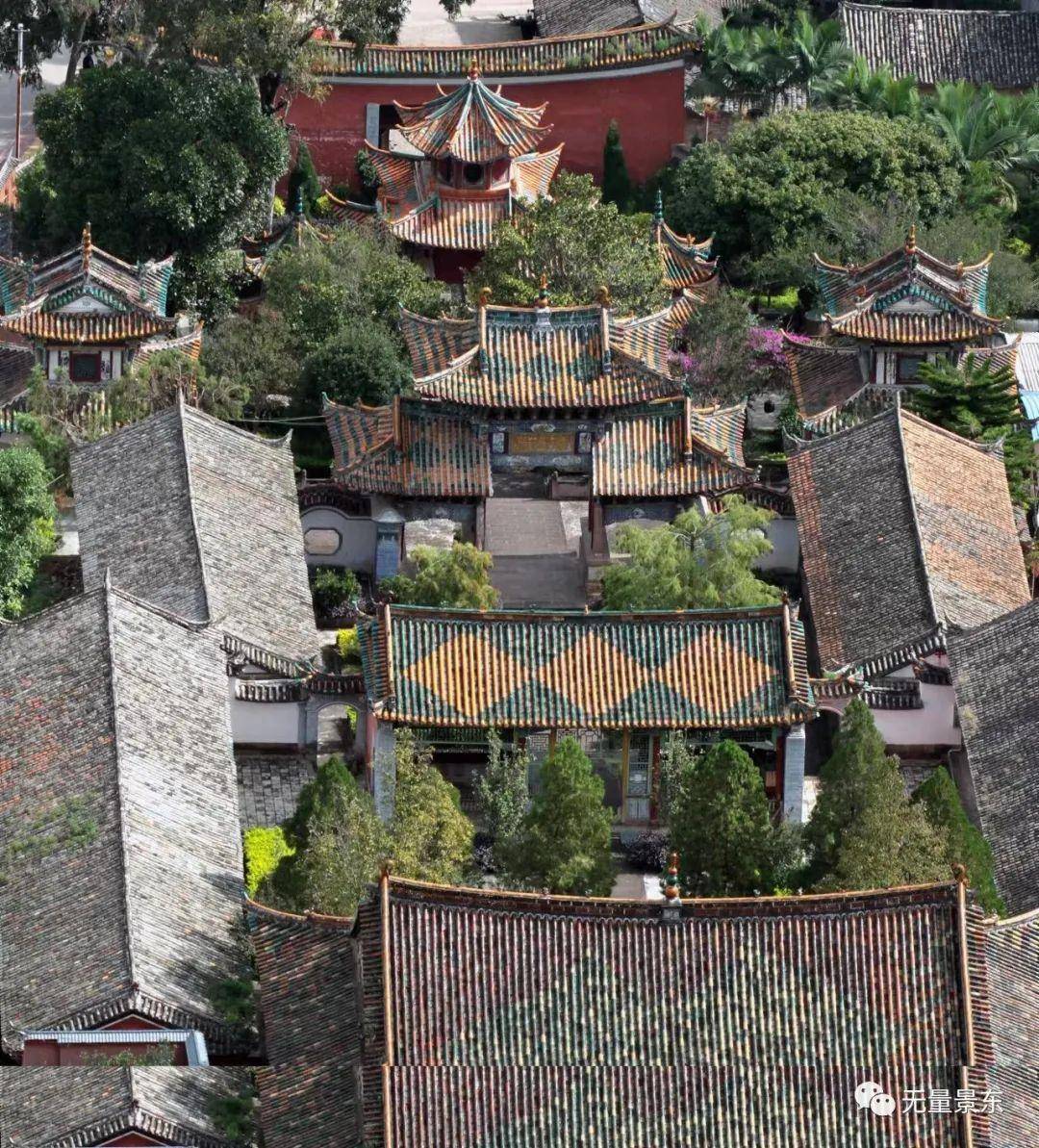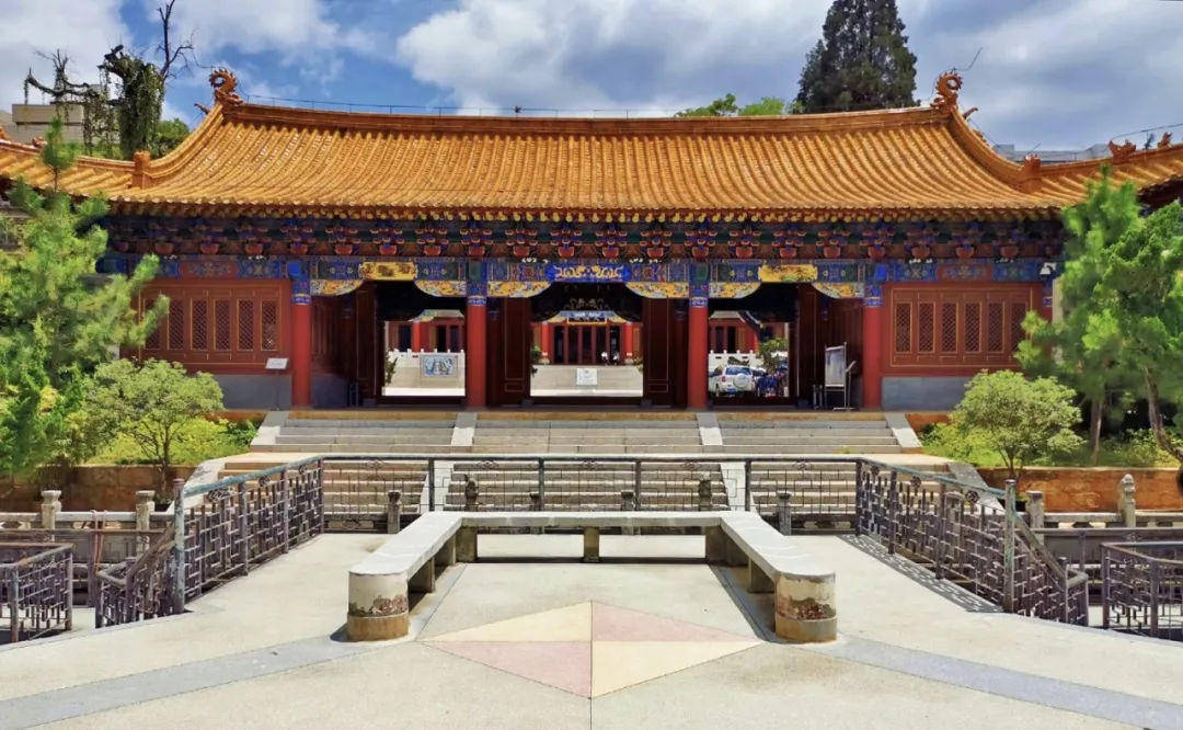 大理文庙建筑群坐西向东,整体为中轴线对称、合院逐台递进式平面布局。走进文庙,迎面便是万仞宫墙照壁,绕过照壁前方的中轴线上是棂星门牌坊,牌坊后是一座汉白玉石桥,桥两侧为泮池,是孔庙建筑群必不可少的元素。大成殿作为文庙的主体建筑,雕梁画栋,黄琉璃瓦覆顶,金碧辉煌,宛如宫殿。