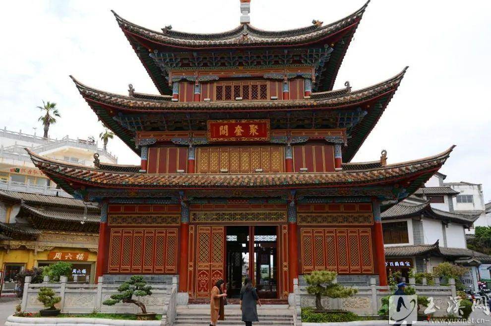 聚奎阁位于玉溪市通海县,总高约17.5米,共3层。聚奎阁飞檐四翘,雕梁画栋,金碧辉煌,结构严谨,工艺精巧,体现了中国传统建筑中榫卯结构的科学性。