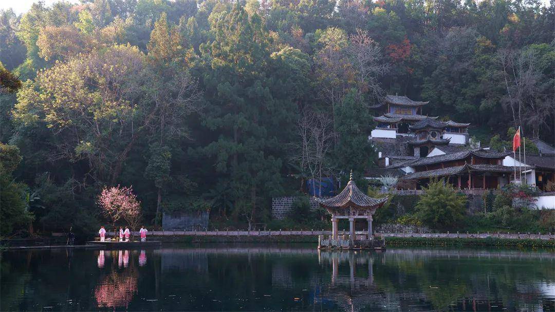 元龙阁位于保山市腾冲市和顺镇水碓村,依山而建,沿中轴线由山门、龙王殿、三官殿、百尺楼及厢房等附属建筑组成。元龙阁背枕青山,前临深潭,四周古木参天,山花遍野,景色迷人,给人以悠然入画之感。