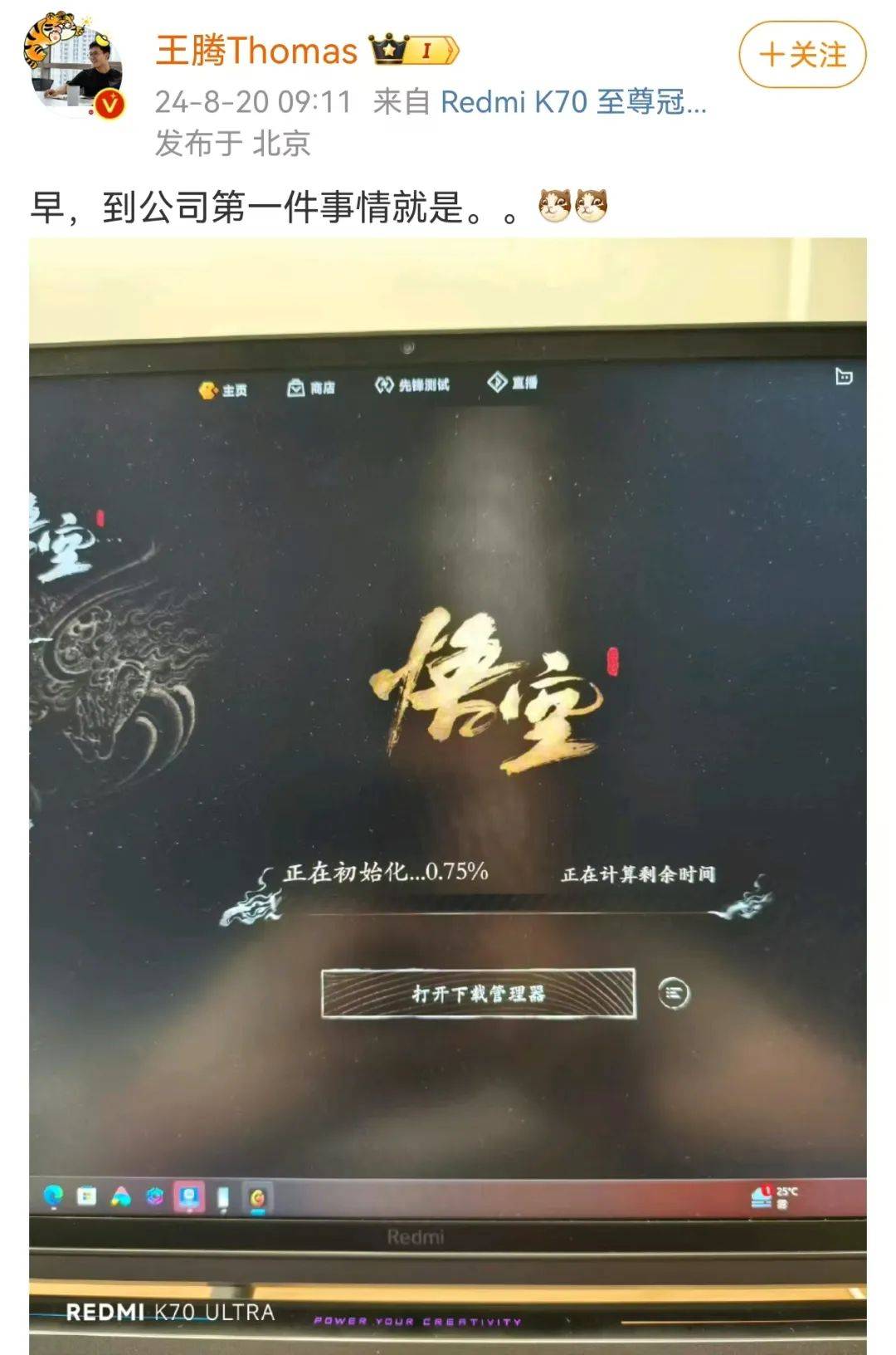 此外,小米中国区市场部副总经理、Redmi品牌总经理王腾微博发文,称“早,到公司第一件事情就是”,从配图来看,王腾今天上班先开电脑进行《黑神话:悟空》预下载。看热闹不嫌事儿大的网友纷纷在评论区整活儿@雷军,并向他告状,调侃王腾此举是“上班摸鱼”。