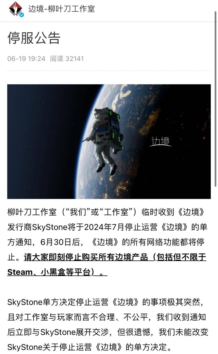 然而在今年6月,正值《黑神话:悟空》开启预售引发一波又一波舆论热潮之时,《边界》却传来即将停止运营的消息。根据《边境》发行商星辰游戏发布的声明,游戏决定停止运营的原因,是由于柳叶刀工作室在游戏上线后,始终未能针对游戏中存在的各种问题作出修改,且在过去一年内也没有做新的游戏内容,让目前游戏的在线玩家人数“几乎为零”。
