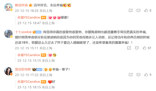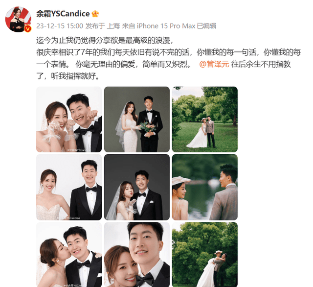 在微博上余霜发文分享了与管泽元的结婚照,并且配文表达了自己的爱意:“很庆幸相识了7年的我们每天依旧有说不完的话,你懂我的每一句话,你懂我的每一个表情。你毫无理由的偏爱,简单而又炽烈。管泽元,往后余生不用指教了。听我指挥就好。”
