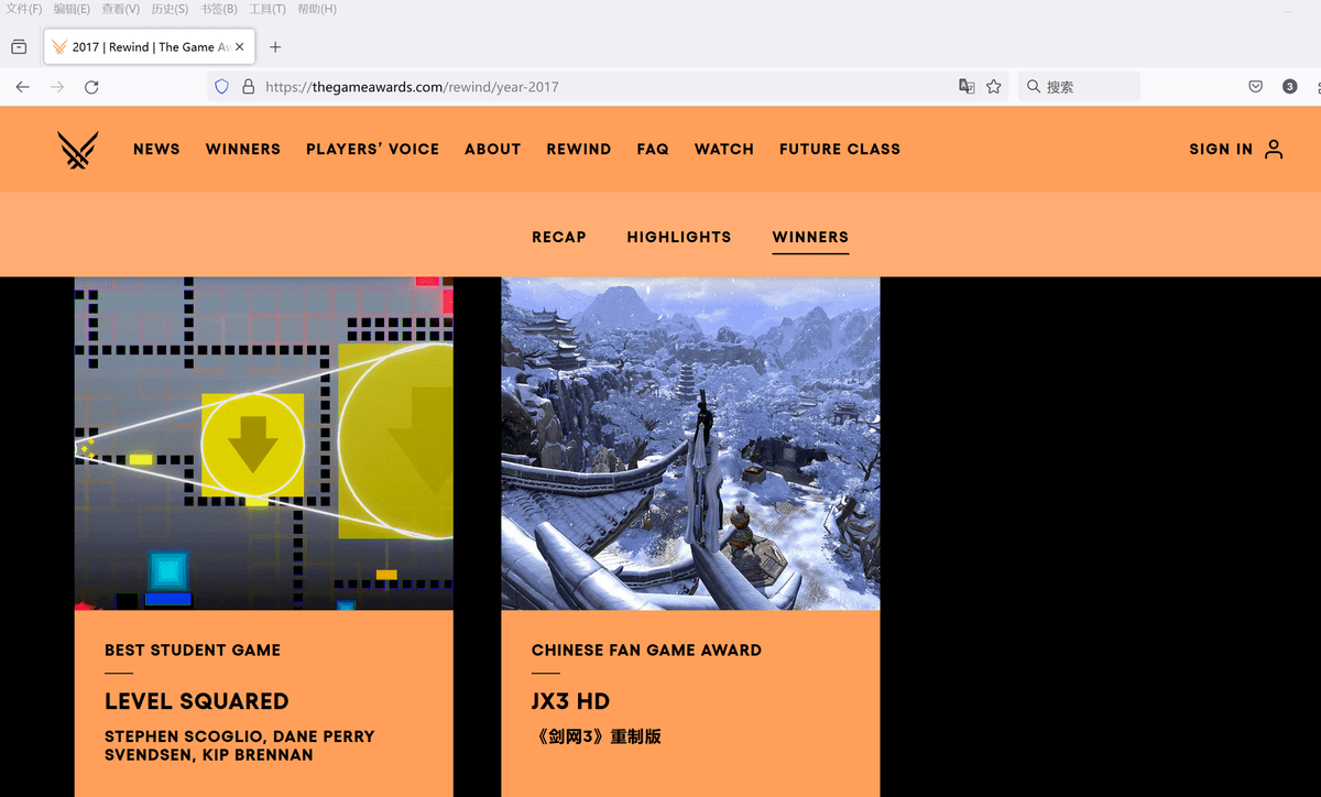 其实早在2017年,就曾有国产游戏在TGA上收获了“最佳中国游戏”的名头,这块游戏就是国产MMO剑网3,时至今日依旧能够在TGA官网上查到这个信息。