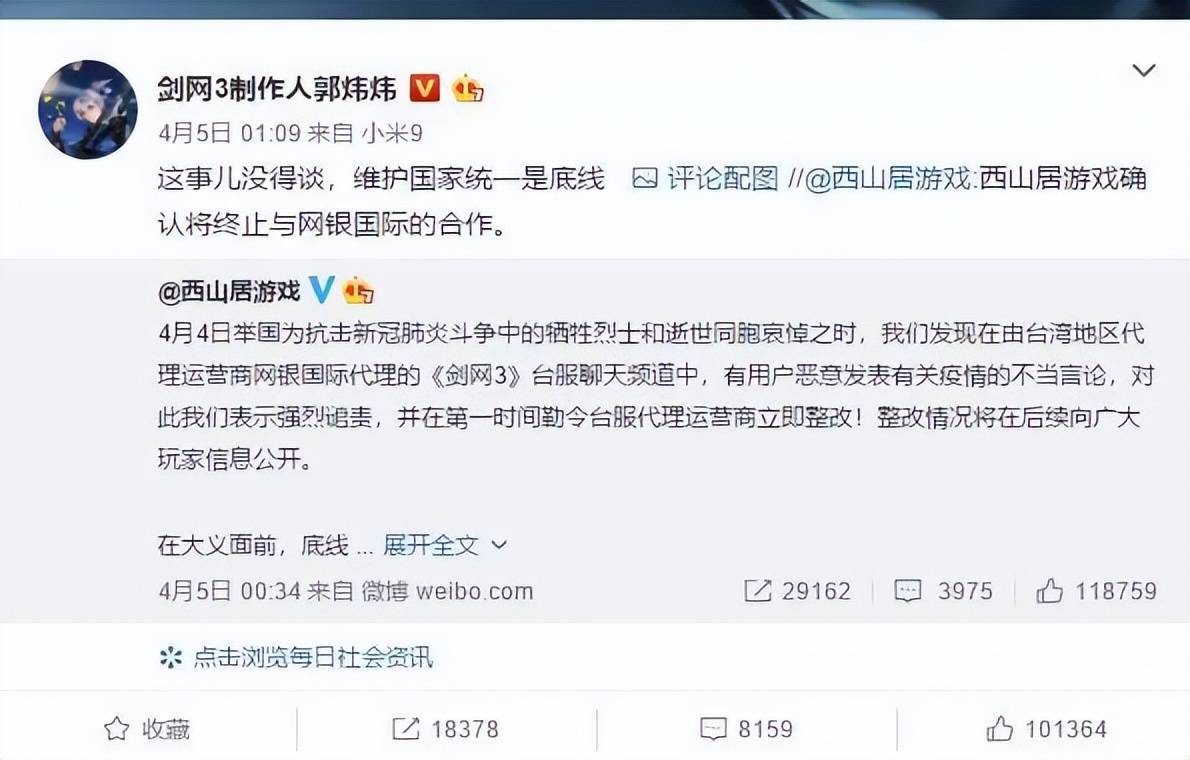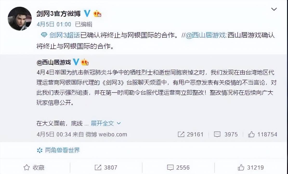 2020年4月4日刚好是国内哀悼日的时候,剑网3台服有玩家发布不当言论,剑网3背后的厂家西山居要求台服代理商处理这些言论的时候,代理商居然百般推诿。