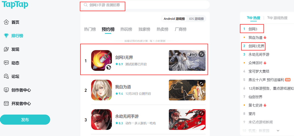 不仅如此,剑网3无界(即剑网3移动端)刚一放出测试的消息就登顶taptap热搜,并持续霸榜taptap预约榜。中无疑给未来剑网3移动端上线开了个好头。更从侧面证明玩家们对于剑网3推出移动端,并数据互通的认可。多年的实力确实不容小觑哇。