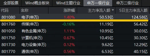 资金面上,截至发稿,电子板块获主力资金净流入50.53亿元,近5日吸金124.58亿元,均霸居31个申万一级行业断层第一!