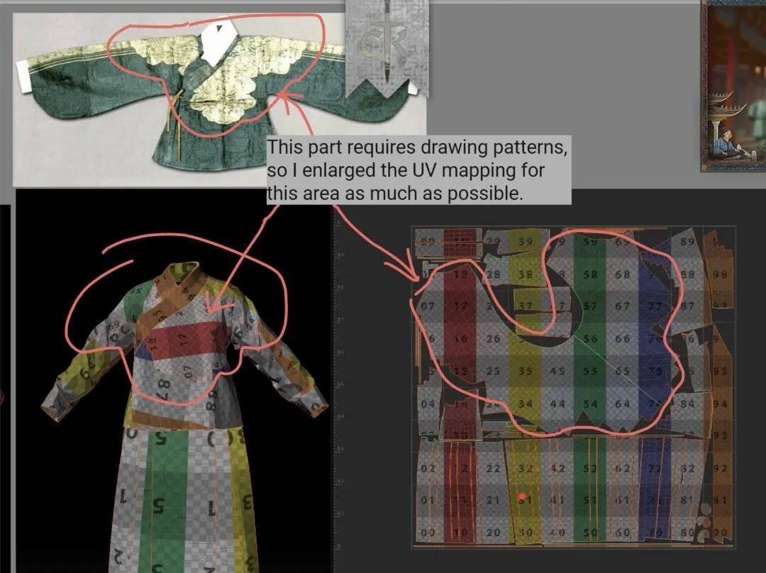 为了解决这个问题,TAMA在进行UV排布时专门将云肩部分拆分出来,并重新手绘纹样,在尽可能放大细节的同时,也要保证其他部分的清晰度。