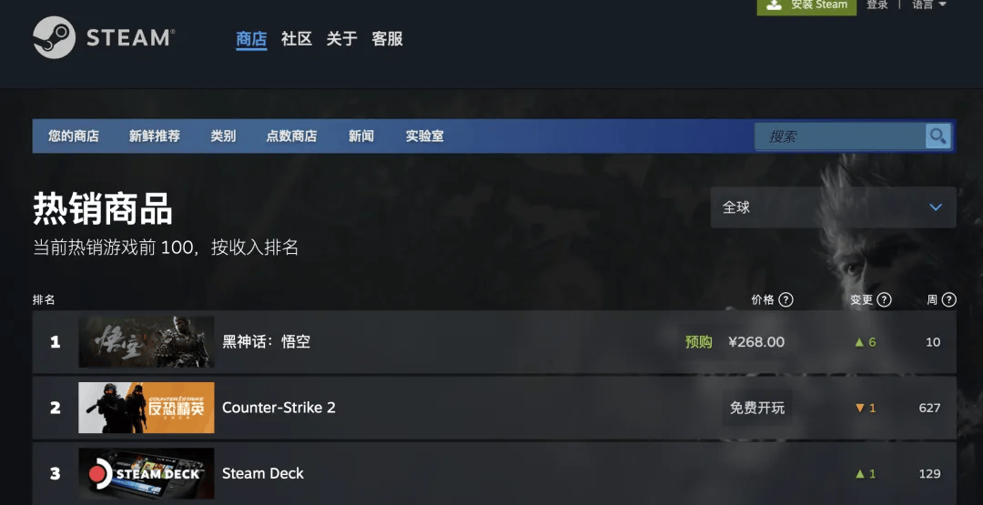 8月20日,游戏平台Steam显示,按照收入计算,目前《黑神话:悟空》排名全球第一,已经有10周进入热销游戏前100。