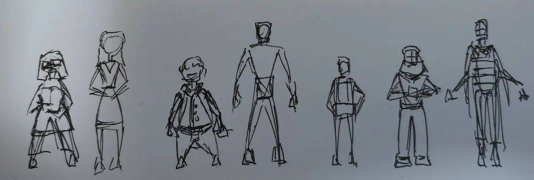 场景工作基本敲定后,开始制作角色。这次希望角色没那么写实,相对有点卡通感,所以最初规划时是想让每个角色都拥有相对比较有特点的比例。接着简单画出大致比例。