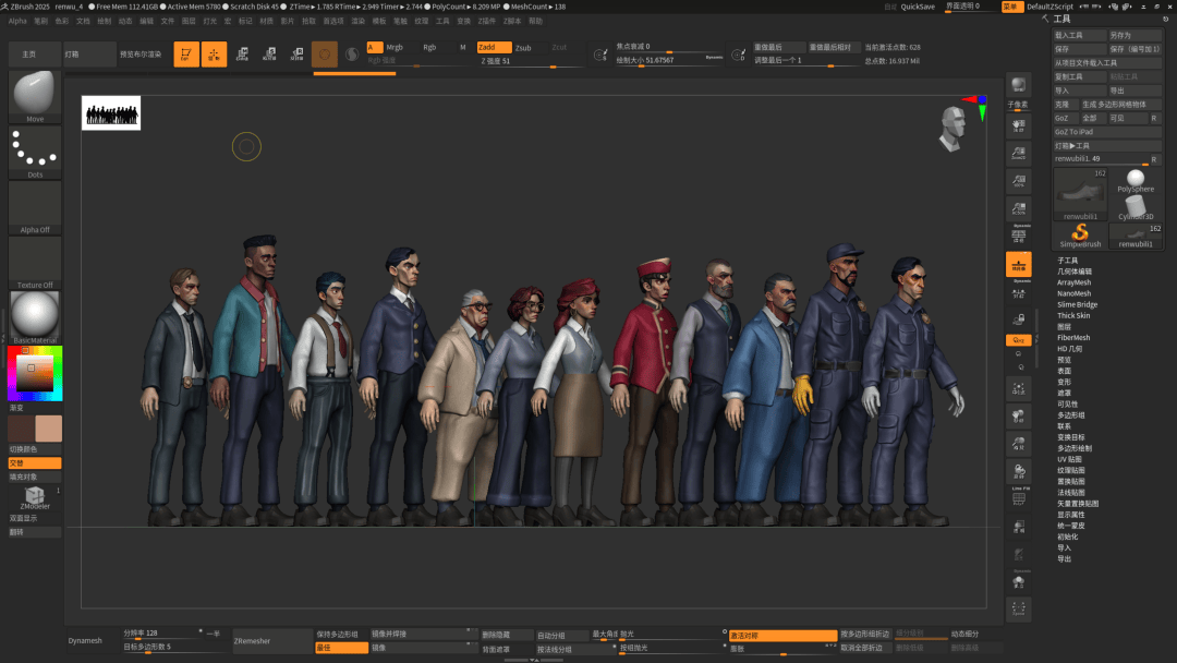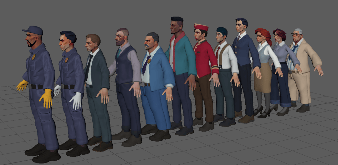 因为以前练过几百个模型速写,所以制作这样的东西还是比较快,大概花费了一周多时间,把需要的 12 个角色的草稿+比较精细的头部全部做完(一些身体体块差不多,可以直接改,鞋子也基本上都是一个模型,所以就是体型加头部)。其中一些手部、鞋子或者头发,其实是用以前做的素材,或者从素体拆解,所以也不是很费事,更多是修改。想了一下,如果结合 Daz 生成应该会更快,主要是卸载 Daz 太久,一直不太会装,感觉很费时间,就自己做了,后续如果考虑走量还是多用这类素材软件会更好,不然确实累。Character Creator 也可以考虑,输出人头应该很快。