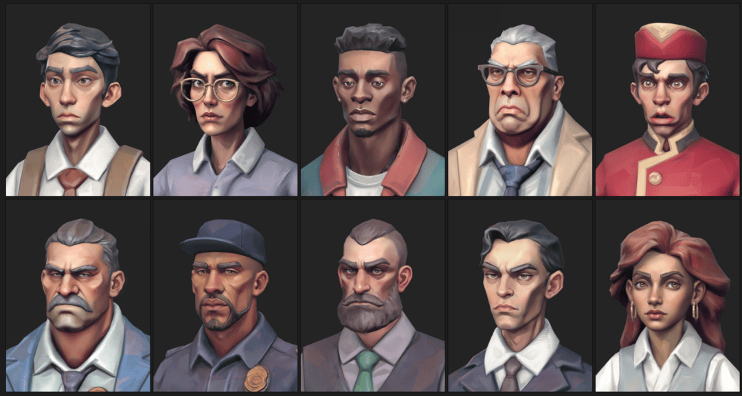 然后渲染一下头部图片,之后进行一些合成和 P 图,为所需的角色全部给出一个头像。有 2 个角色用不到头像,就没有专门去做,因为这个步骤比较费力,不少地方都得自己手动补,基本上就是把模型减面以后丢失的细节修整干净,再优化颜色、画一些高光之类的。