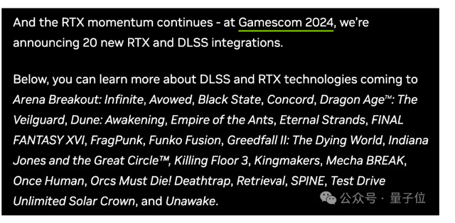 展会间英伟达透露,除了《黑神话》之外,已有超过600款游戏和应用支持了DLSS和RTX技术,并宣布又有20款新游戏加入到了这一队列。