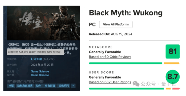 游戏口碑方面,Steam平台迅速达成96%好评率“好评如潮”,MetaCritics平台用户评分也来到了8.7高分。