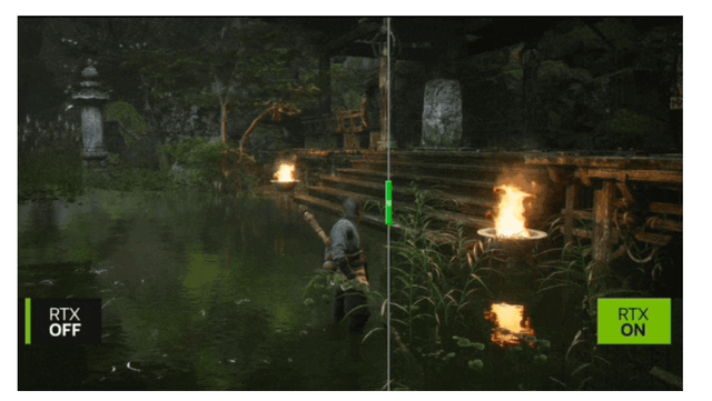 比如在这个场景中,开启光追前后火焰的效果变化明显,开启前水面下未出现的反射也被补齐了。