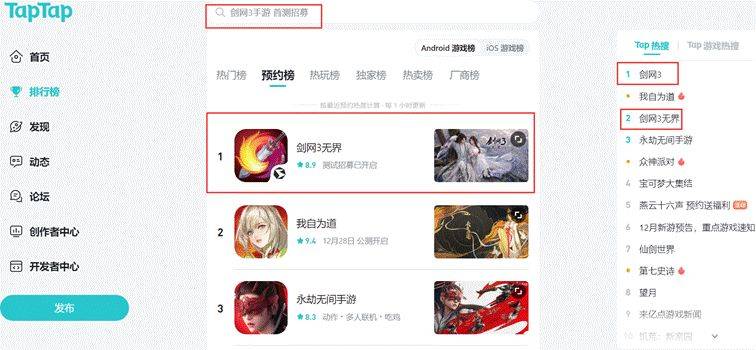 与此同时,剑网3无界(即剑网3移动端)也憋了个“大招”出来一波终结了比赛。随着包含实机画面的新pv“载梦行舟”正式上线,西山居也趁势开启了技术性互通共研测试的招募活动,直接抽一批幸运儿获得提前试玩的资格。要知道自从西山居宣布要做移动端开始就有无数玩家眼巴巴等着游戏上线,如今不仅大饼要出锅了,这饼的卖相看上去还甚是诱人,自然是将大家的期待值又拔高了一层,taptap热搜与预约榜自然是不出意外地被剑网3无界直接霸榜。