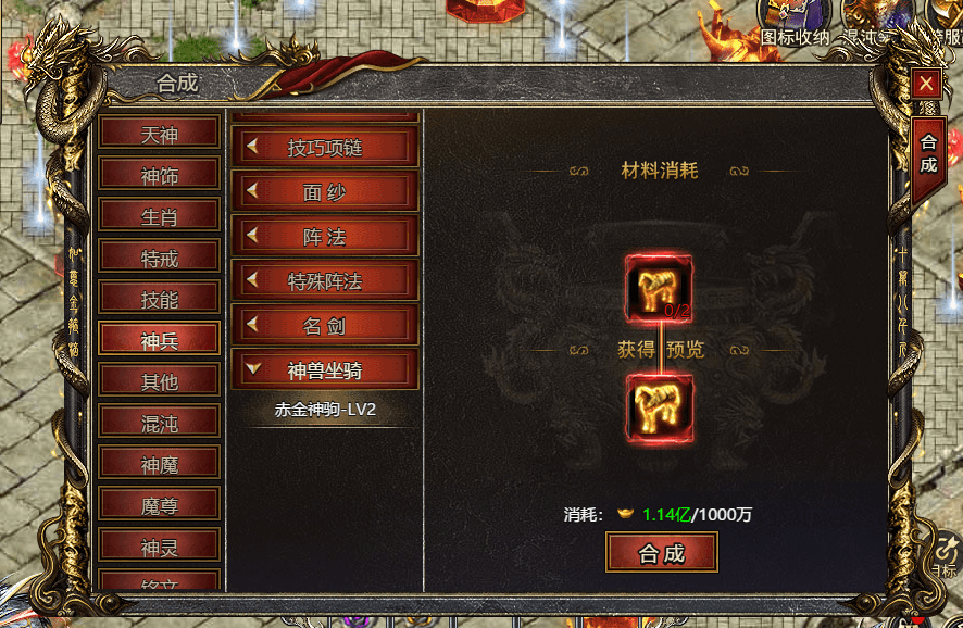 想要获得神兽坐骑,可以通过游戏中的一些运营活动,有机会获取1级的神兽坐骑。获得其他高级坐骑神兽需要使用合成系统,将两个完全相同的坐骑神兽合成更高一级的坐骑神兽。合成需要消耗大量的元宝,合成成功几率为100%。
