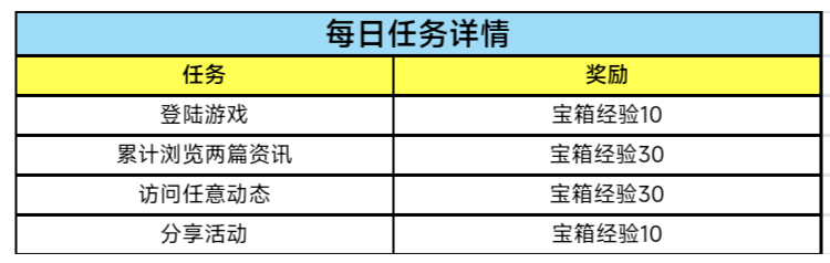 这次的任务也是十分简单,CFer只需要在掌火完成一些活跃行为,积累经验值。经验值达到一定数量时,可提升补给箱等级,从而获取更丰厚的道具奖励。具体的活跃行为大家也可以参考下表: