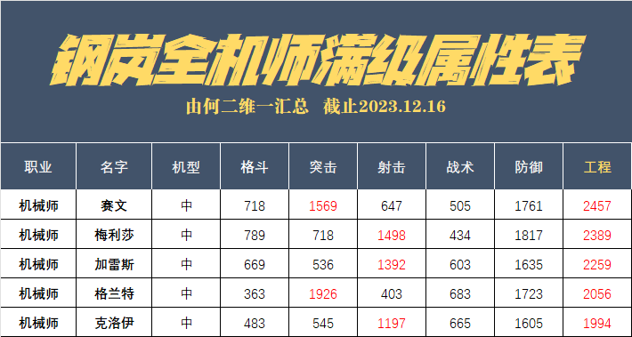 针对奶妈机师我们重点注意2个属性即可,一是工程属性,这个直接决定了奶量多寡,二则是他们的突击/射击属性,这两者谁高便决定了这位奶妈更应该带哪一类武器,当然其中也会和奶妈们的技能机制息息相关,例如梅利莎的射击属性高,那么带狙击步枪的话技能具有更广的射程,这也能帮助她更好配合友方进行协战而给友方进行回血。