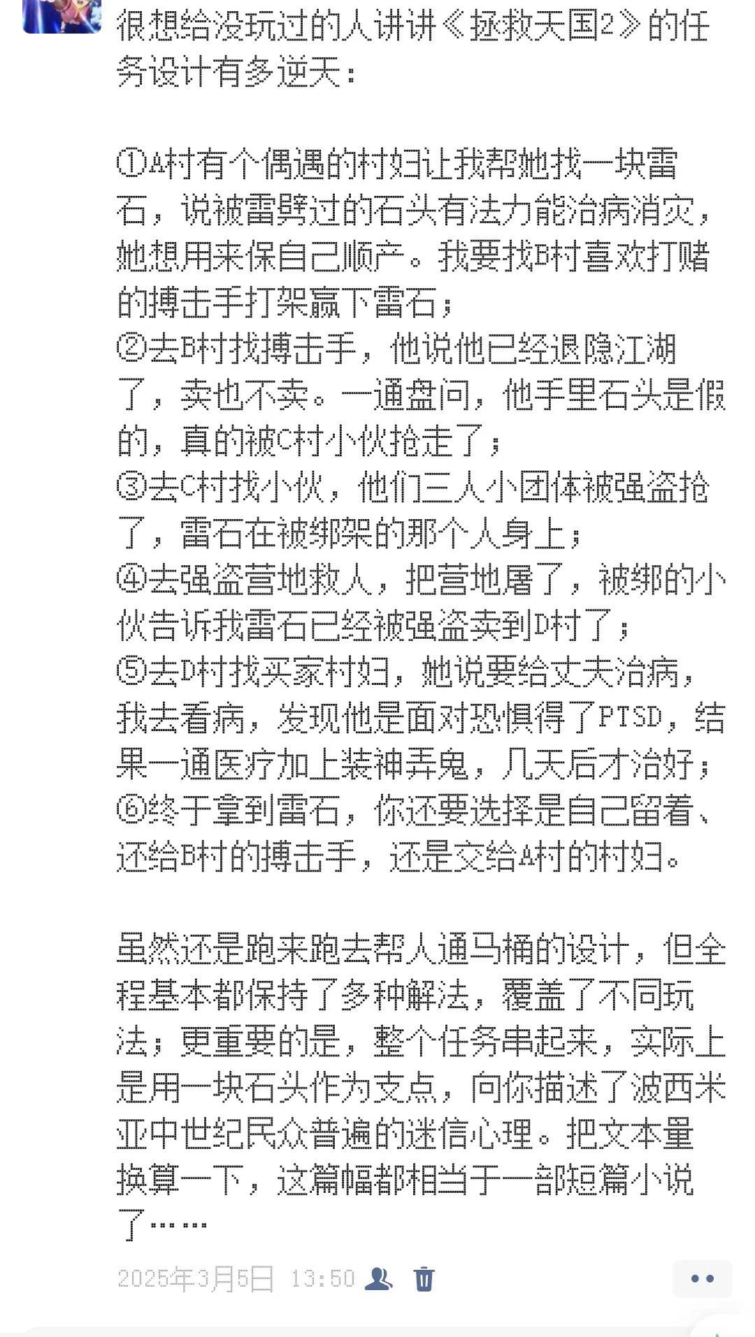 而KCD2就不一样了,它基本做到了全面提升。在一代主打中世纪模拟器体验的基础上,进一步把沉浸感、真实感拉满了。当然,游戏里有挺多繁琐、硬核到反人性的设计,但却很少有人会抱怨。很多从业者反而是赞誉颇多,也对它特别高级的叙事体验印象深刻。