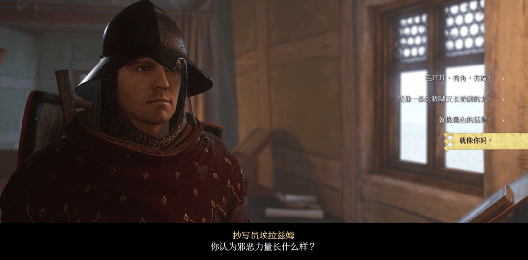我们不害怕这些,我们就想给你展示一种诚实的视角,这让游戏充满了极其干涩的幽默。我认为这特别重要,因为游戏的原始语言是捷克语,它被翻译成英语后也保留了这种独特性。捷克式幽默非常干涩,有时有点刻薄,它很像爱尔兰式幽默或英式幽默。
