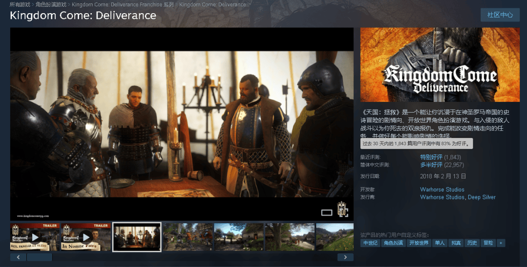我们的第一款游戏《天国:拯救》,是个Kickstarter众筹项目。很多人都知道,我们在资金方面遇到了困难,因为发行大厂不想投资,我们不得不转向社区,最终社区帮了大忙,我们才于2018年2月发售游戏。如今,它在Steam上有83%的好评率——我是说如今。