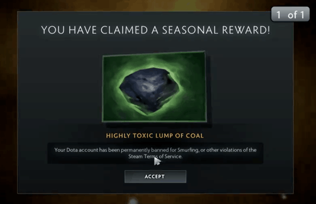 同时,《DOTA2》会向所有玩家发放一份“季节性奖励”,而名列“淘气王”榜单的玩家在打开礼物盒时将会收到一个名为“剧毒”的煤炭块,并且将被永久封禁(VAC)。这正是发生在职业选手和主播梅森身上的事情,在他打开V社礼物后惊讶地发现自己的账号被禁止使用,并公开承认曾经使用过非正当手段提高游戏表现。