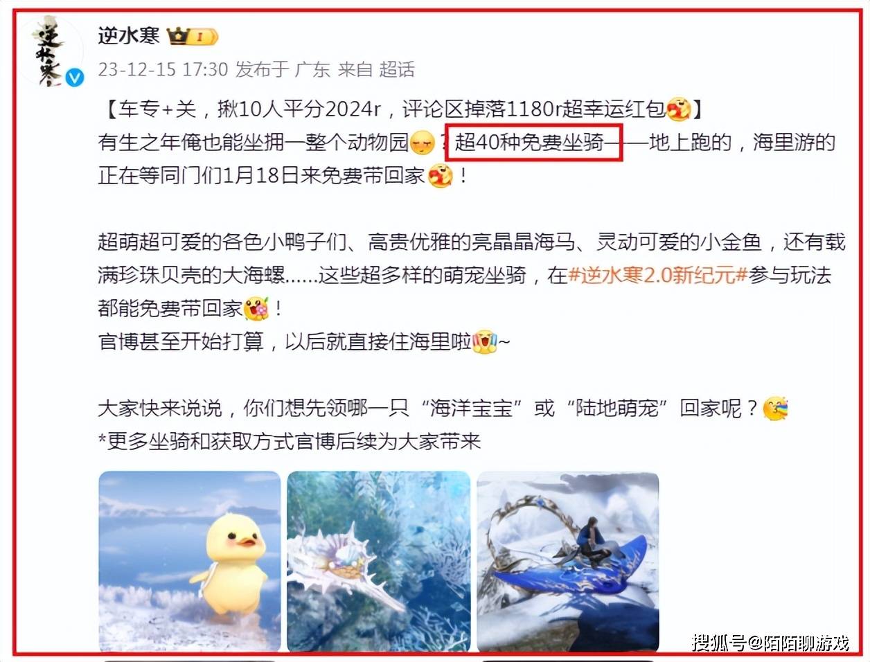 即将在1月18日开启的逆水寒2.0时代,官方又放出大料,这次送坐骑送得更夸张、更离谱、更震撼,一口气要给玩家送超过40只祥瑞坐骑,比上个赛季翻了一倍!