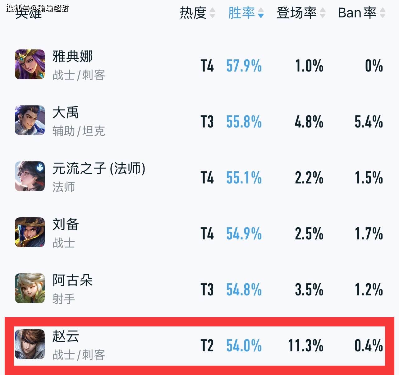 我们可以看一下前面五位角色,虽然他们的胜率比赵云还要高,但是他们的出场率并不高,而赵云拥有 11.3% 的出场率,胜率却稳定在 54%,这也足以证明这个英雄在加强之后确实是得到了大幅度的提升。