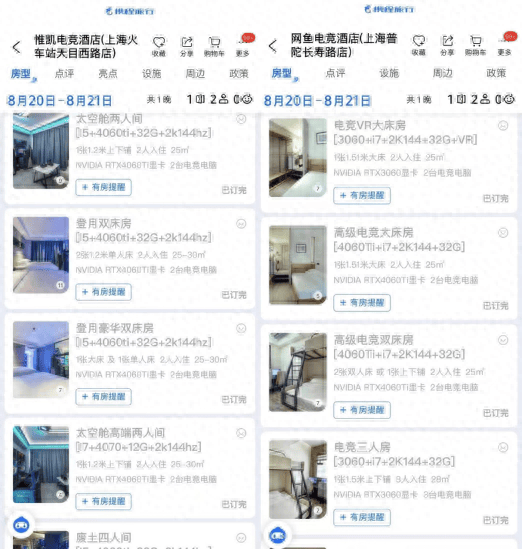 (记者从携程旅行App看到,不少电竞酒店的多人房型今晚售罄)