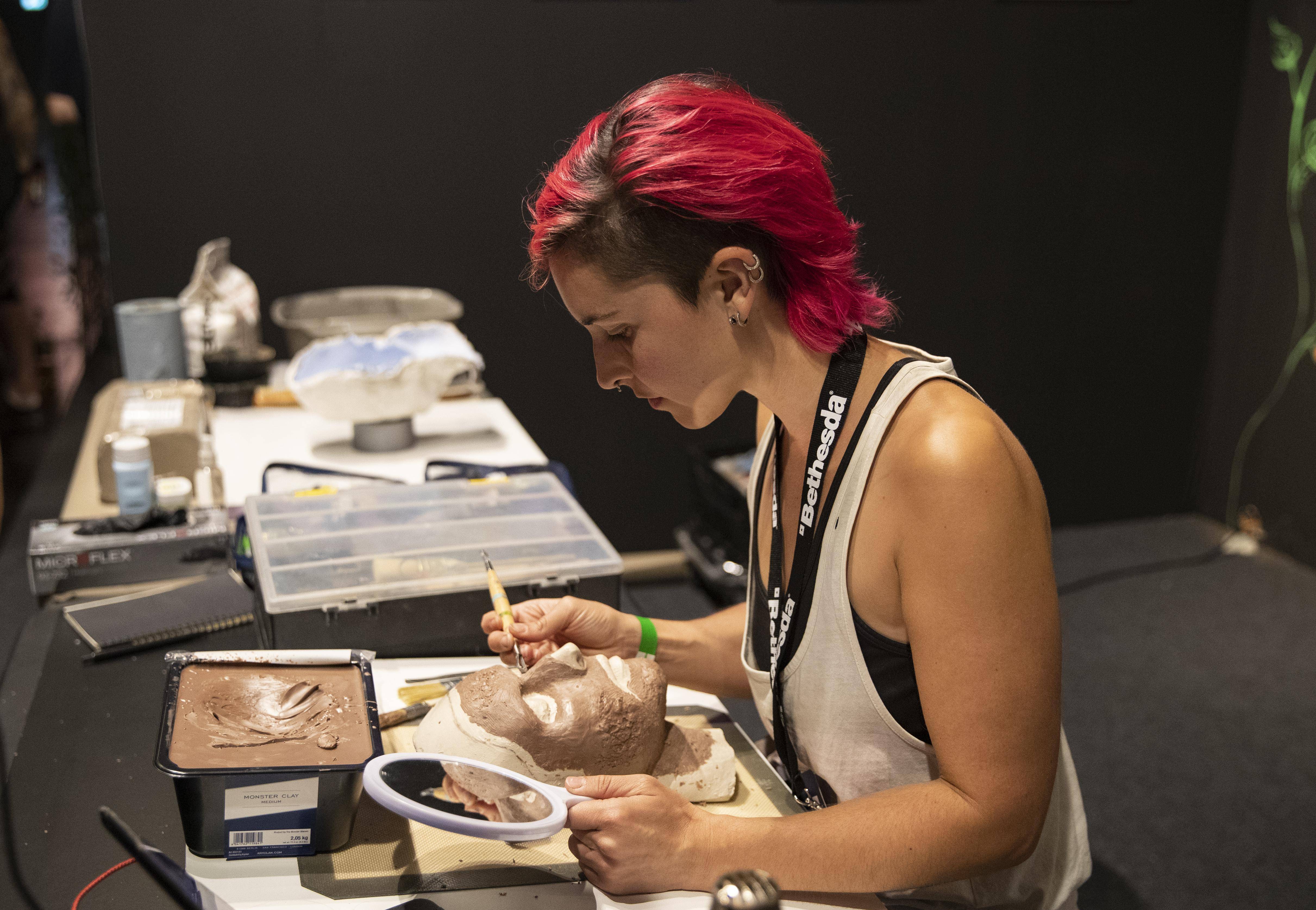 8月21日,一名女子在德国科隆举办的科隆国际游戏展上制作道具。 新华社记者 张帆 摄