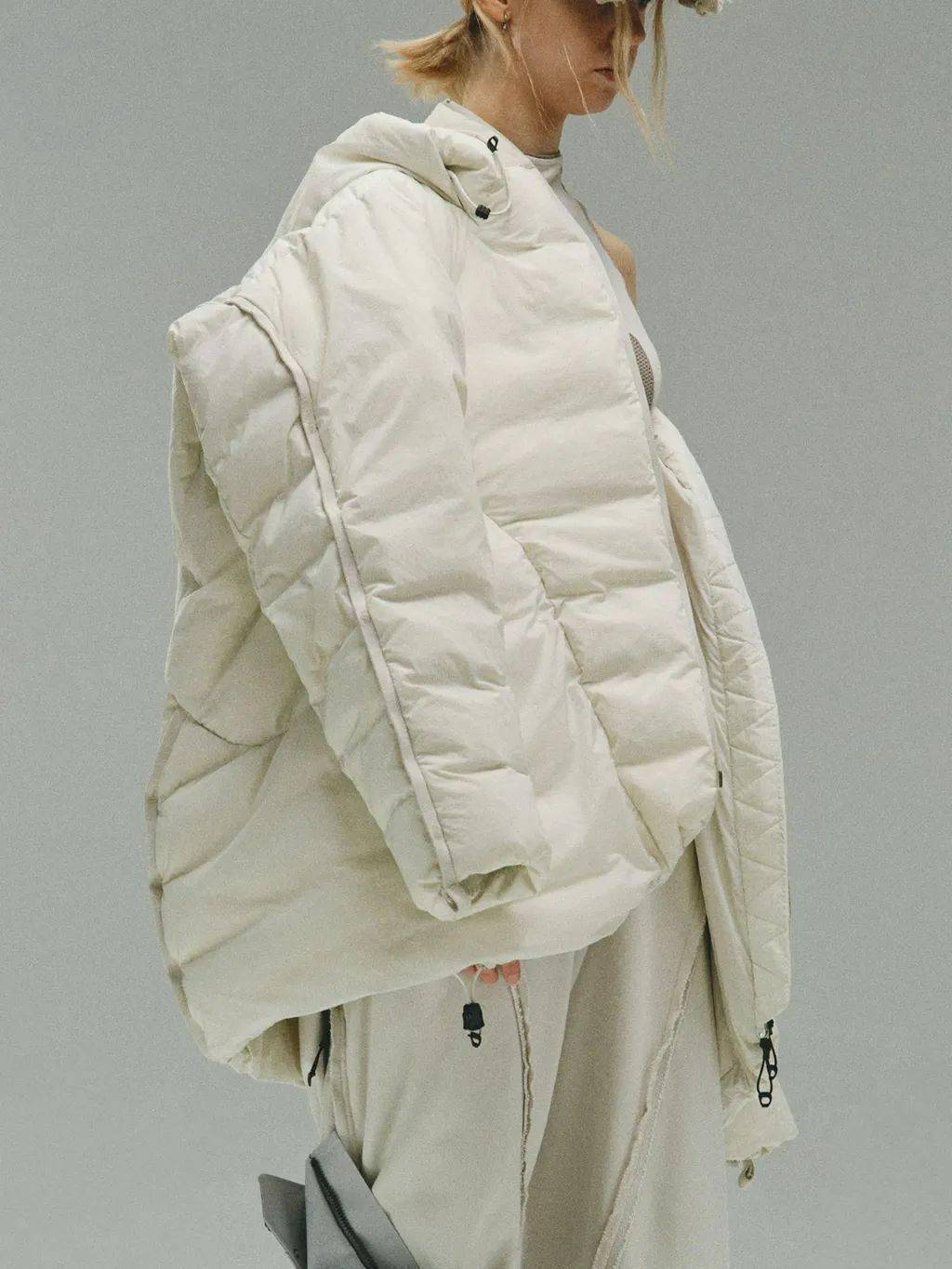 最大特征便是袖筒的可拆卸结构,温度升高时,可将手臂伸出,亦或是变换为羽绒马甲模式,实现多种穿着形态。