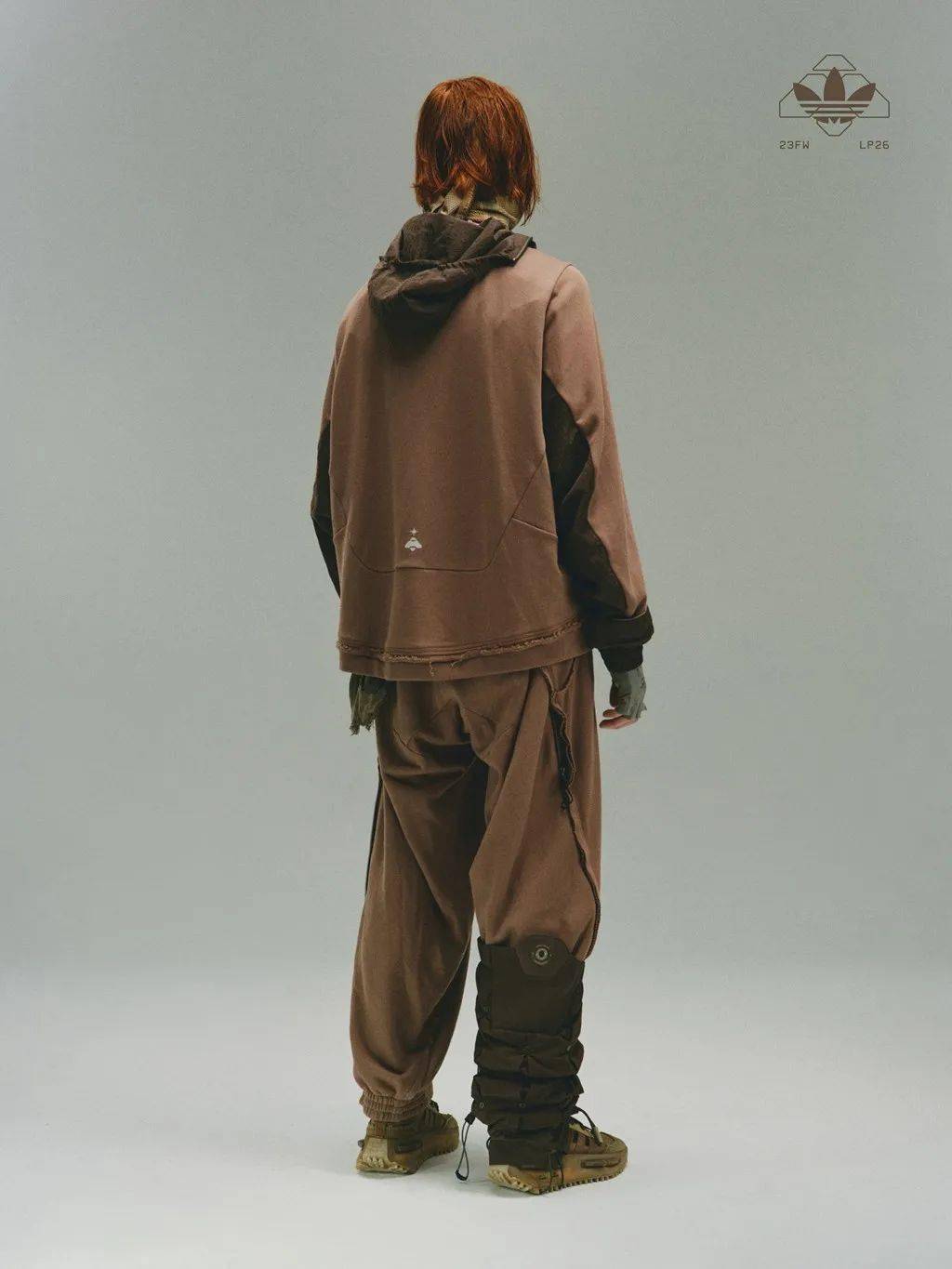 下装方面,JEJE 选择了外露拼骨通勤长裤,外露的毛边拼缝工艺突显废土气质。