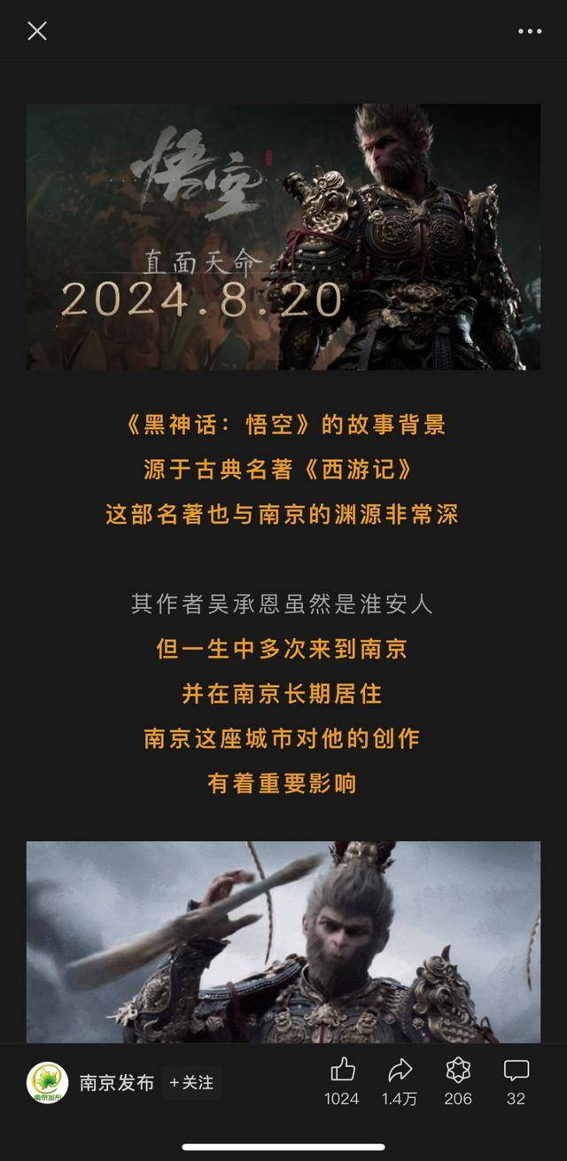 “南京发布”更是直接当妈,一篇标题为《悟空:南京妈妈为你骄傲》的文章指出,《黑神话:悟空》的美术总监杨奇是南京人。