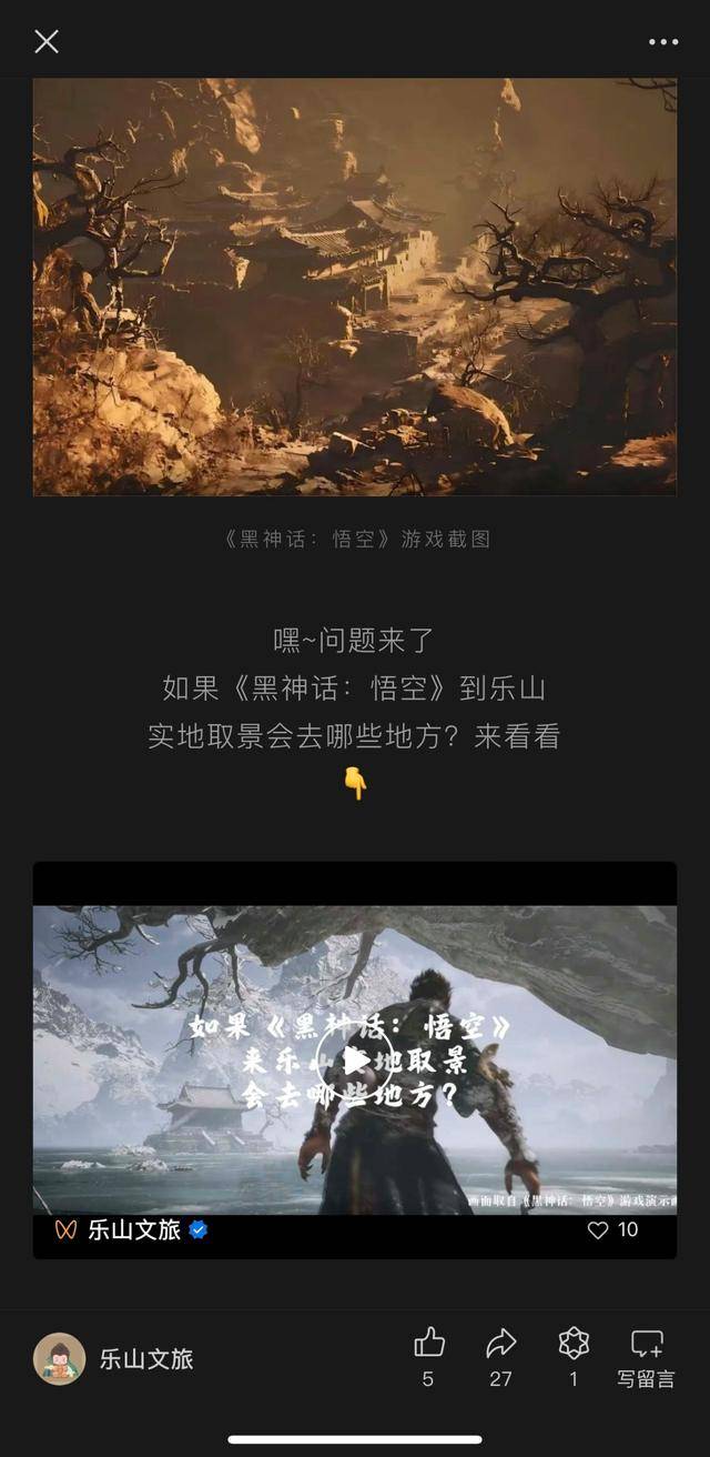 四川乐山市文旅局发布的推文则是假设“如果《黑神话:悟空》来乐山取景”,顺势宣传了乐山大佛、灵宝塔、三佛寺、千佛岩、峨眉山金顶华藏寺等景点。