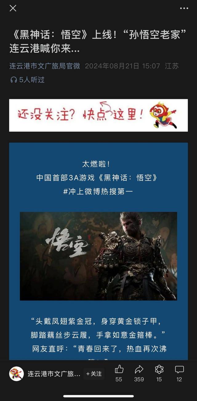 直到8月21日15时许,连云港市文旅局的推文才姗姗来迟,这篇《“孙悟空老家”连云港喊你来》的推文写道:“在连云港,这座被誉为‘孙悟空老家’的城市里,你可以找到很多孙大圣的“周边”,让你身临其境感受西游文化,认识更加立体全面的齐天大圣。”