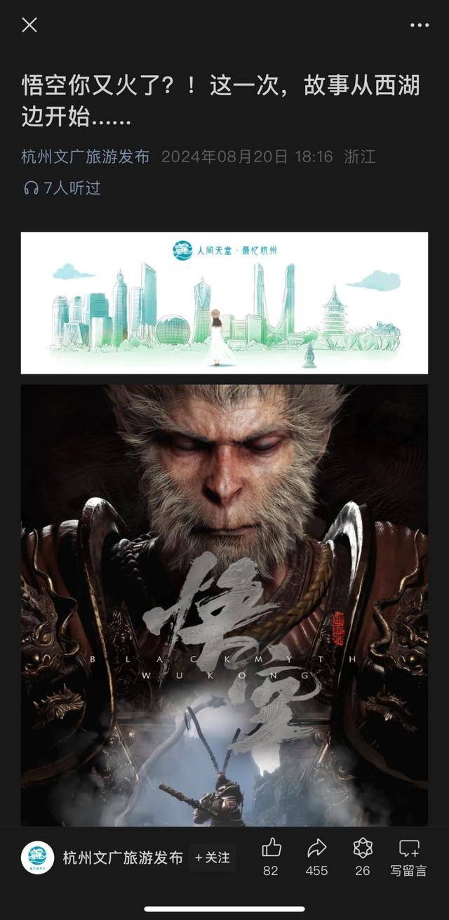 而“杭州文广旅游发布”的消息认为,全网刷屏的“悟空”来自西湖边:“早在2018年,制作人冯骥就将主创团队搬到杭州西湖区的一个创意产业园里。因为他喜欢杭州的氛围,节奏没那么快,耐得住性子。可以说,孕育出这只灵猴的,是西湖的山水。”