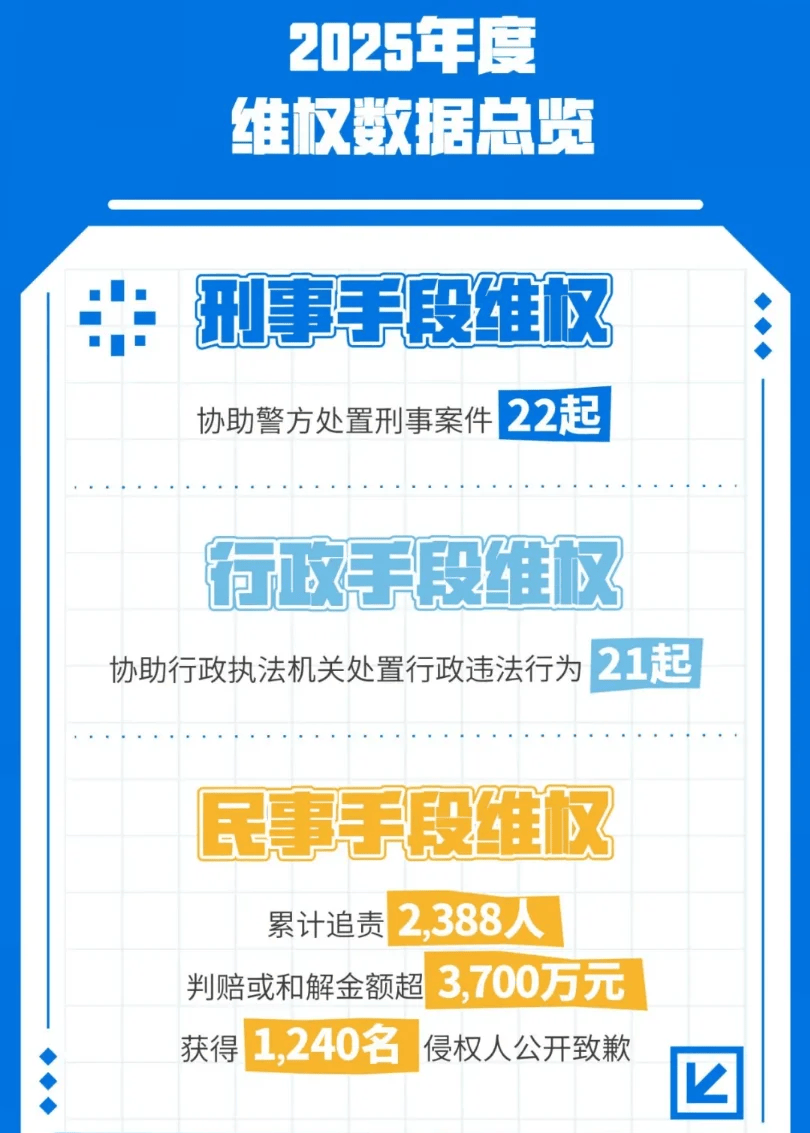 与此同时,平台侧侵权治理也在同步推进——全年共下架侵权链接109242条,封禁988个违规侵权账号,并关停3622个黑灰产店铺。