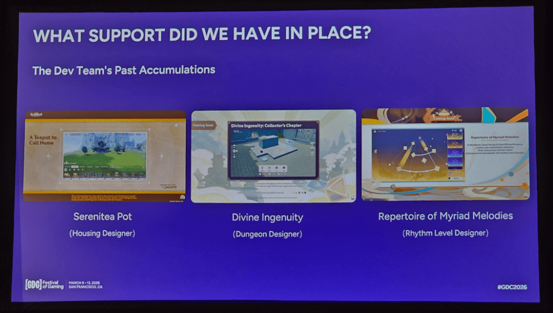 其次,我们拥有一支超过1000人的开发团队,以及庞大的游戏资产库。这些资产为UGC创作提供了坚实的视觉基础和高度成熟的素材资源。此外,团队已经在游戏中设计了多种玩法类型,以保持内容的新鲜度并满足不同玩家的需求。正如幻灯片所展示的框架,玩家可以基于《原神》的原创内容创作属于自己的世界——无论是偏向治愈与放松的“尘歌壶”风格,侧重战斗的“神工天巧”玩法,还是强调技巧挑战的“千音雅集”类型。