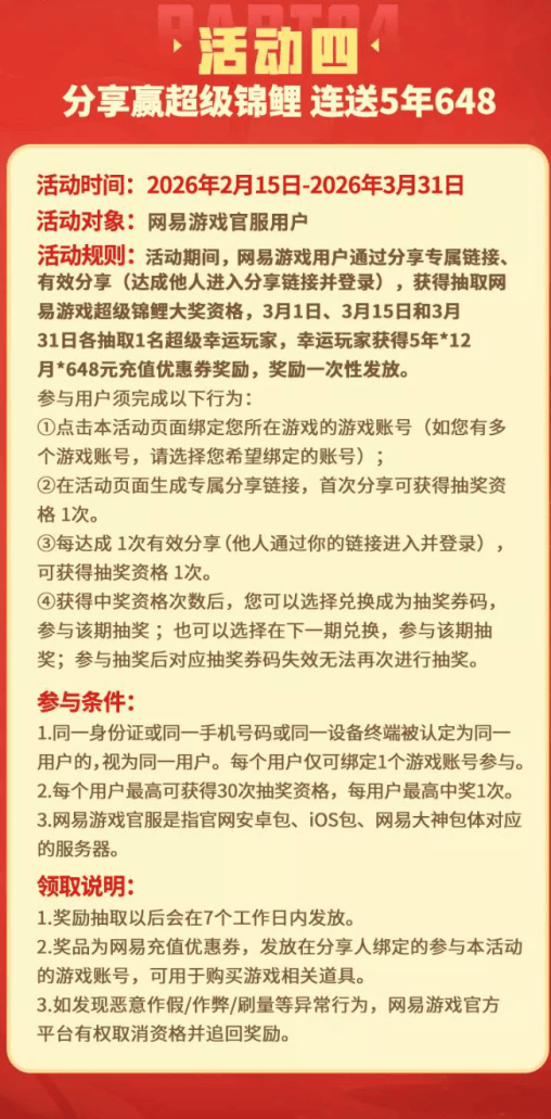 而且每个注册新玩家还能必中充值券,老用户邀请新玩家每成功一次便能获得一张6米优惠券,如果分享活动,之后5年每个月都能参与超级锦鲤抽奖,最高可获648米优惠券,简直让人香到不行,直呼为何不早点告诉我福利这么爽啊!