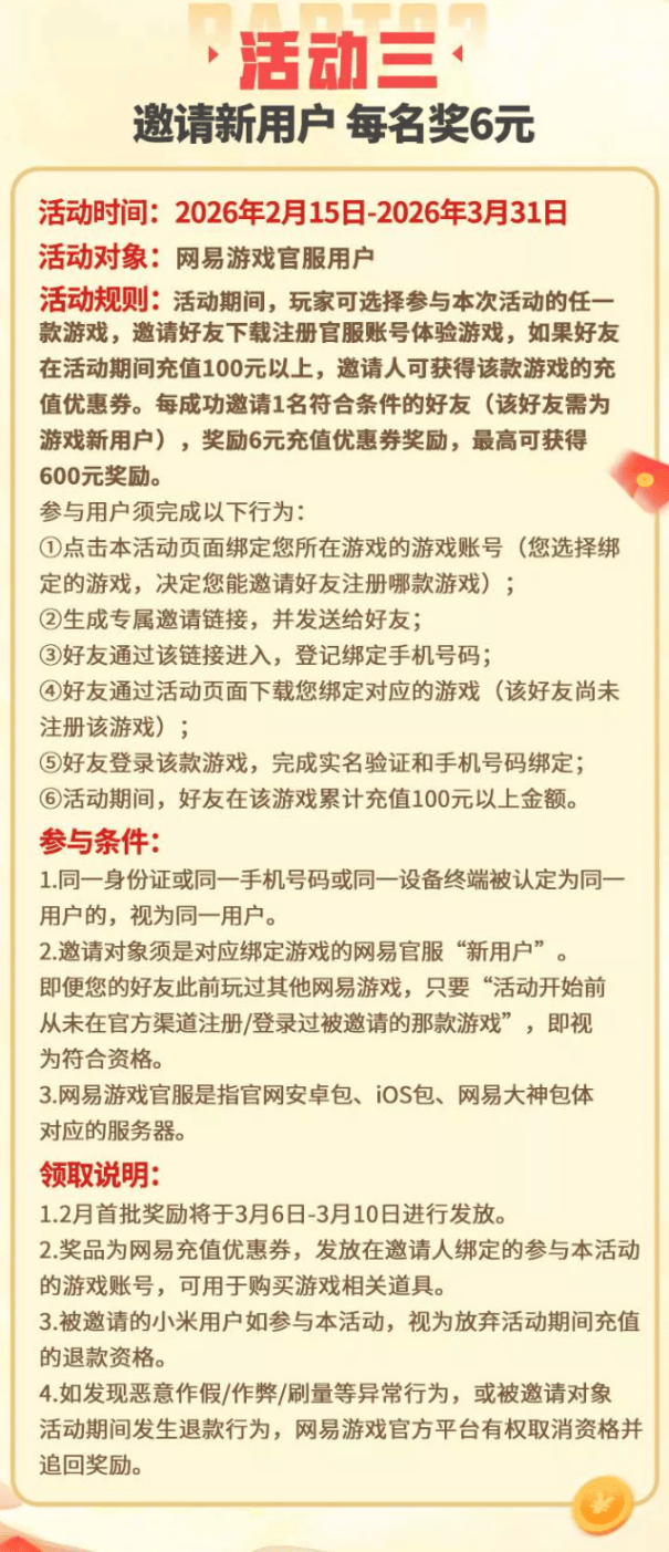 所以这下大家也明白为何官服对渠道服玩家会有这么大吸引力了吧!如果你是小米渠道服玩家,那么现在就是你入驻官服的最好机会!因为网易游戏针对小米渠道服用户,专门打造了官服入驻专属福利活动,别的不说,只要你首次注册登录并充个首充6米,就能直接 100%返还6米充值优惠券,福利爽度直接翻番!