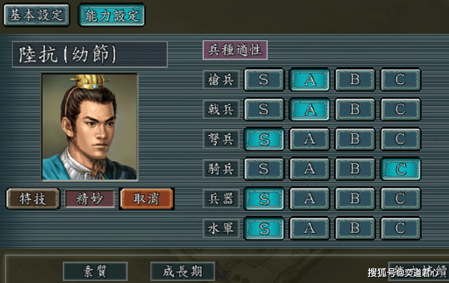 五个掌握精妙的角色,除了徐庶之外,其余四人都出现得非常后期。陆抗比陈泰还要后生,这个阶段其实已经不大刚需技巧点数了。故而陆抗的兵种适应性虽然相当全面,却极少能被玩家们记住。